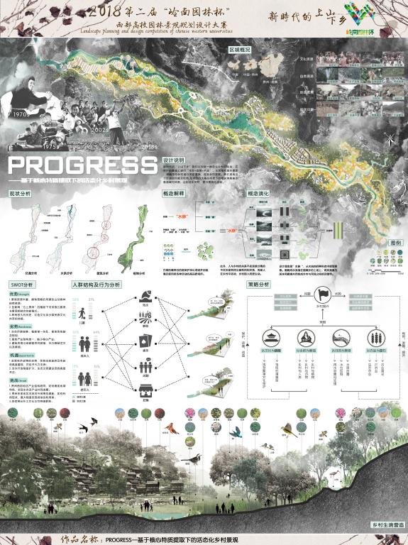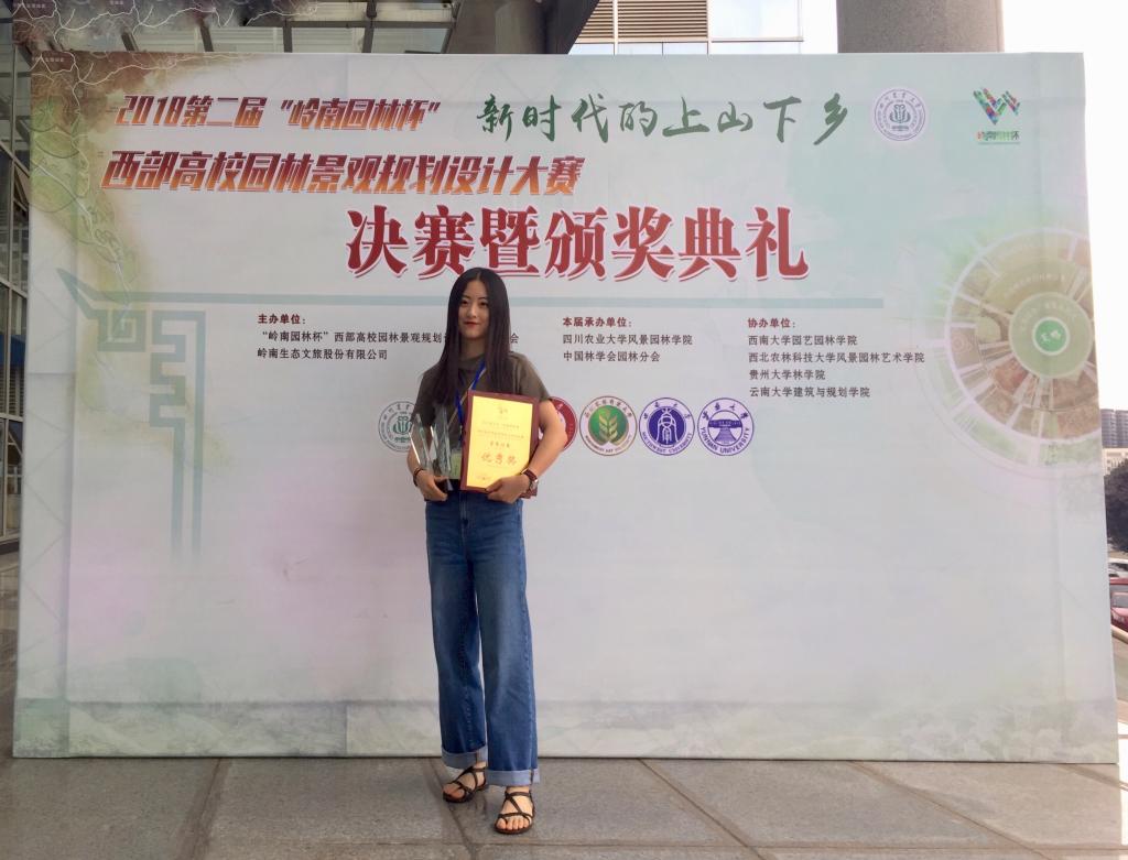 2018年5月30日至6月1日,第二届“岭南园林杯”西部高校景观规划设计大赛决赛在四川农业大学举行。入围决赛的21支队伍同场竞技,进行了现场展板评分、作品汇报及答辩等环节。我校报送作品《Progress——基于核心特质提取下的活态化乡村景观》(参赛学生:谢佳玲、姚映、张坤懿;指导教师:罗融融)共收获优秀奖、最佳人气奖两枚奖项,实现了我校风景园林专业自2014年创办以来在学生专业设计比赛中的重要突破。