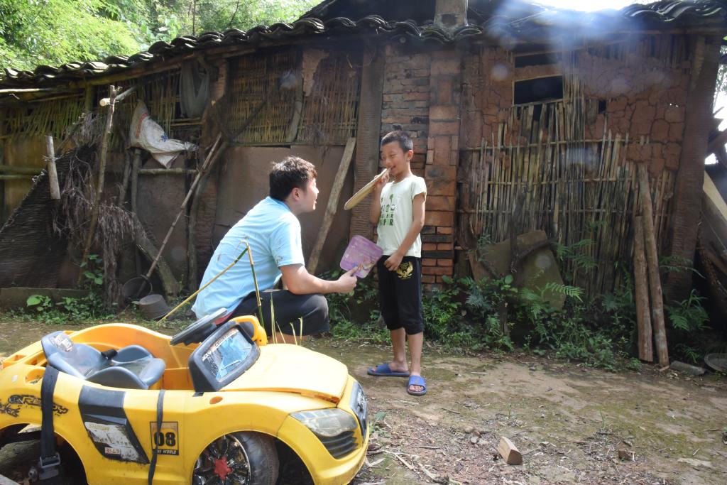 在屋外,志愿者问道柯言小朋友会不会画画,柯言说不会,于是志愿者就利用最原始的树枝和泥土给小朋友上了一堂简短的美术课。在讲解美术知识的同时,志愿者还开导小朋友,让他自己以后自己一个人没事做的时候可以把自己的梦想,或是最近发生的事情用画画来把它记录下来,不要自己一个人闷在家里看电视。