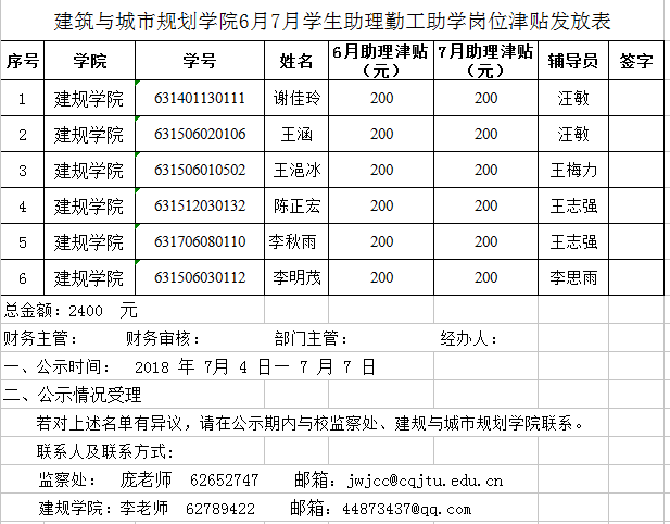 建筑与城市规划学院6月7月学生助理勤工助学岗位津贴发放表