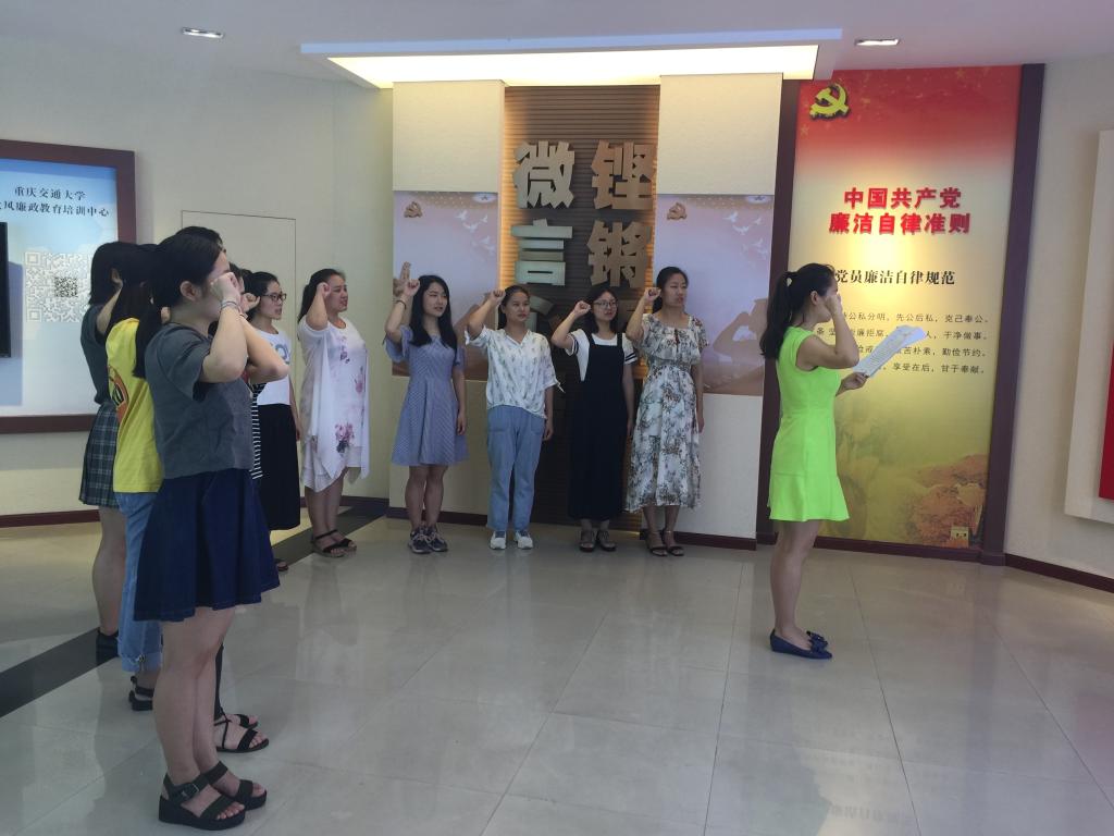 根据学校党委组织部关于集中开展“七一”入党宣誓主题党日活动的通知安排,为纪念建党97周年,进一步增强党员意识,强化党员身份,不忘初心,牢记使命。学院于6月21日组织预备党员、正式党员师生代表,在“七一”前夕到学校党风廉政教育培训中心(南岸校区图书馆二楼),集中开展入党宣誓主题党日活动,统一开展“新党员入党宣誓,老党员重温入党誓词”。仪式由学院学工办主任、团委书记、学生党支部书记李思雨主持和领誓,重温入党誓词后,党员同志参观了党风廉政教育培训中心,参加活动的党员同志纷纷表示:以后要铭记党员身份,自觉做到廉洁自律。