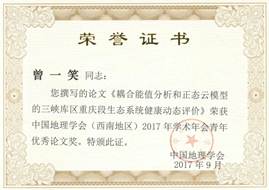 年会闭幕式上,颁发了本届年会青年优秀论文奖,10名青年学者、研究生获此殊荣,学院硕士研究生曾一笑获得青年优秀论文奖。崔鹏院士代表中国地理学会和中国地理学会西南地区代表处对本届年会做了总结,他对本次年会专家学者的热情参与、会议期间的浓厚学术氛围给予了充分肯定和赞赏,提出西南地理工作者应“守土有责”,为西南地理学研究做出自己应有的贡献。