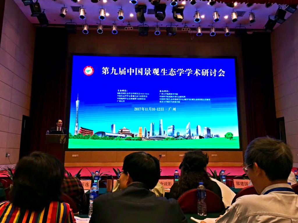 2017年11月10-12日,第九届中国景观生态学学术研讨会在广州大学召开。本次年会主题是:“科学?文化?智慧 I 中国景观生态学新进展”。我校官冬杰教授主持第三分会场“景观可持续与土地系统设计”学术交流,并作“长江经济带城市蔓延冷热点格局及演变趋势模拟”项目课题报告。