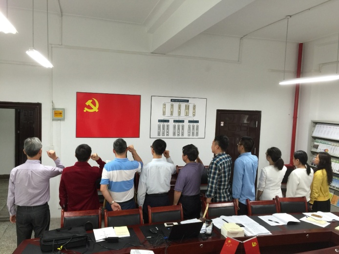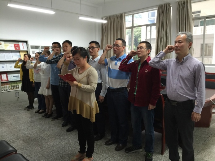 会议第二项议程为支部全体党员重温入党誓词。在支部组织委员牟凤云老师的带领下,全体党员面向鲜红而神圣的党旗,郑重地举起了自己的右手,重温入党誓词。