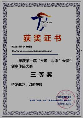 2016年4月23日,第一届“交通·未来”大学生创意作品大赛决赛在西南交通大学犀浦校区大学生创新创业教育中心举行。未来交通概念设计35支决赛队伍进行现场展示并接受了评委现场问辨。学院报送作品《onthe wing—未来城市多功能立体消防系统》(参赛学生:臧益波、蔡林杉、赖瀚瀚;指导教师:任鹏宇、董莉莉)荣获未来交通概念设计三等奖,实现了我校建筑学专业在全国大学生学科竞赛中又一次重要突破。