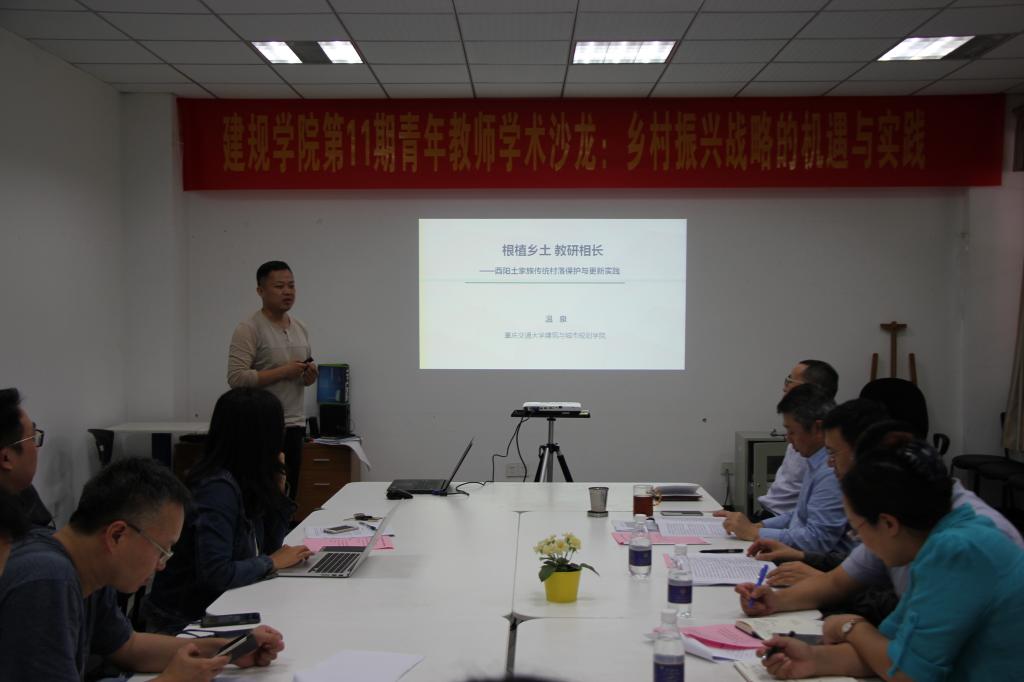在接下来的交流环节,来自学院建筑学、城乡规划、人文地理和国土资源不同专业的老师,从自身研究角度共话乡村建设:陈春副教授从“农村土地问题”入手,围绕重庆“以地入股”、“以房联营”两种乡村发展模式进行了深入探讨;朱航老师以乡土工业遗产保护的实际案例——贵州茅台酒厂酿酒作坊的保护利用入手,探索了当下语境下乡土遗产的保护与发展问题;喻歆植博士以赴开州区满月乡、长寿区锯梁村等地调研的亲身感受,以“空心村、城乡收入差距、农民增收”等方面新鲜数据为据,围绕“乡村认知”引导大家展开了讨论,分析了当前乡村建设中的社会资本、社区经营等问题。大家各抒己见,共同探讨高校教师如何以自己的知识和力量为乡村发展服务。