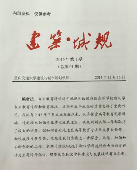 在十八大新常态、新理念指引下,在高等教育转型发展、内涵提升的新阶段,在启动“十三五”规划的时间节点,学校抢抓机遇,优化学科专业布局,于2015年7月组建成立了建筑与城市规划学院。为加快教学研究型学院建设与发展,強化教学中心地位,深化教育教学改革,加强创新创业教育,学习借鉴兄弟高校办学经验,经学院党政研究,决定创办院刊《建筑·城规》。希望广大师生员工积极参与、建言献策,适时提供更多更新的学科前沿动态、国家地方政策、行业发展咨询、人才市场需求以及同行院校研究等信息,以便我们认真研究,推动学院发展。在此,对首期院刊编制工作付出努力的董文静、张灵艺、温泉、关海长等同志表示衷心感谢,也希望全院教职工继续支持她们的工作。