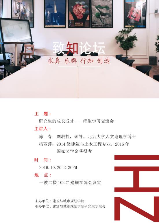 最新公告: · 学院举办第七期“致知论坛”:人生导航与专业发展    10/23      · 致知论坛第七期海报:人生导航与专业发展——新老师生交流大会    10/19      · 建规学院研究生“致知论坛”第六期:艺术与生活的跨界融合    05/22      · 致知论坛第六期海报    05/18      · 建规学院研究生“致知论坛”第五期:观戎马丹心,踏复兴之路    04/10