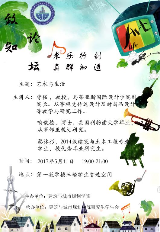 最新公告: · 学院举办第七期“致知论坛”:人生导航与专业发展    10/23      · 致知论坛第七期海报:人生导航与专业发展——新老师生交流大会    10/19      · 建规学院研究生“致知论坛”第六期:艺术与生活的跨界融合    05/22      · 致知论坛第六期海报    05/18      · 建规学院研究生“致知论坛”第五期:观戎马丹心,踏复兴之路    04/10