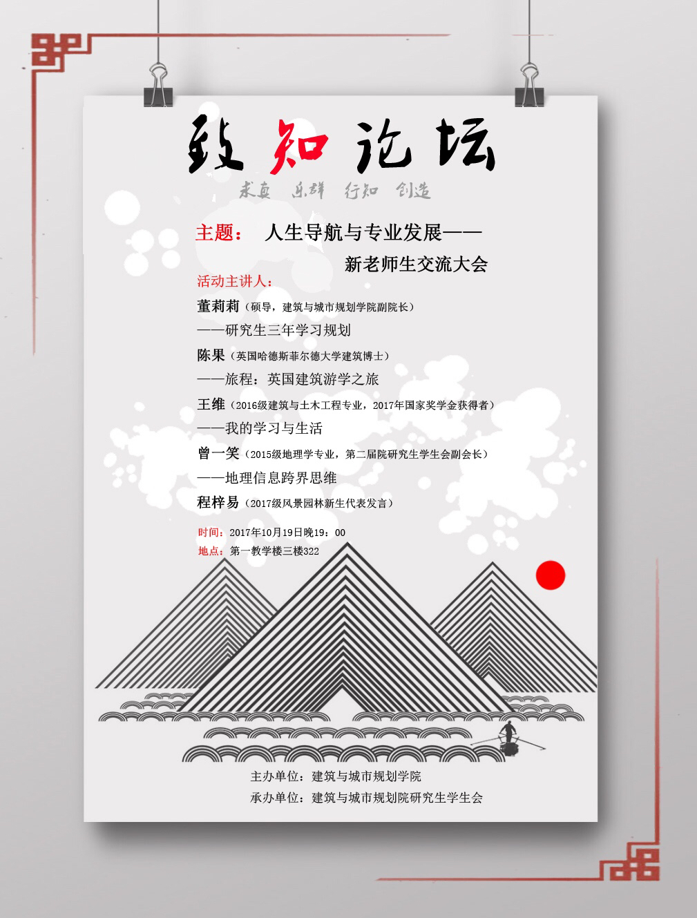 最新公告: · 学院举办第七期“致知论坛”:人生导航与专业发展    10/23      · 致知论坛第七期海报:人生导航与专业发展——新老师生交流大会    10/19      · 建规学院研究生“致知论坛”第六期:艺术与生活的跨界融合    05/22      · 致知论坛第六期海报    05/18      · 建规学院研究生“致知论坛”第五期:观戎马丹心,踏复兴之路    04/10
